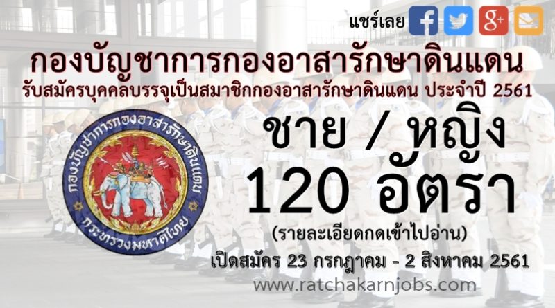 กองบัญชาการกองอาสารักษาดินแดน เปิดรับสมัครสอบเพื่อบรรจุเป็นสมาชิกกองอาสารักษาดินแดน (อส.) จำนวน 120 อัตรา รับสมัครด้วยตนเอง ระหว่างวันที่ 23 กรกฎาคม - 2 สิงหาคม 2561